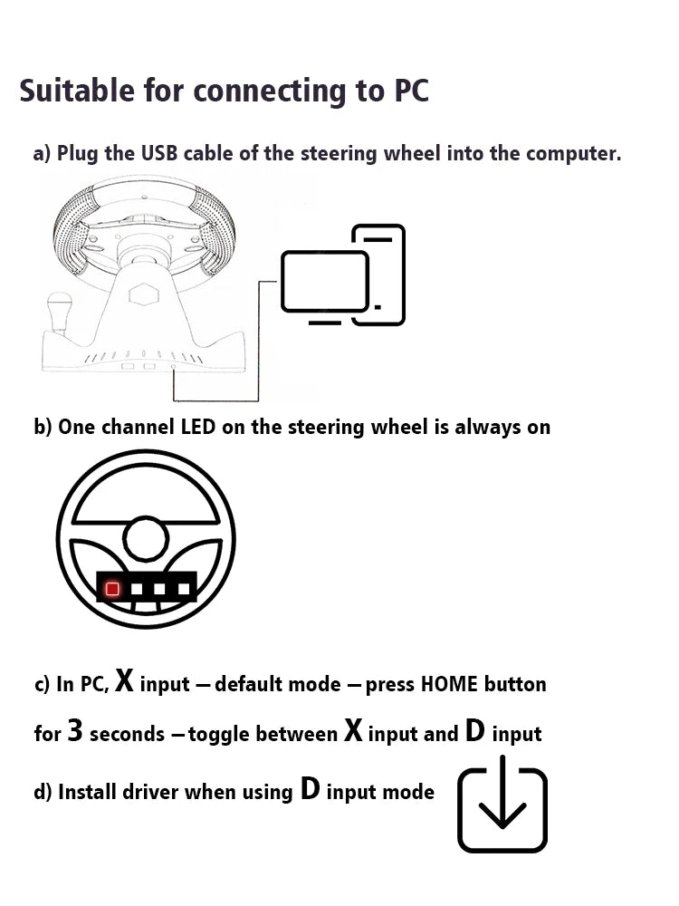 b) When one of the red channel LEDs on the racing wheel is always on, it is ready for use.