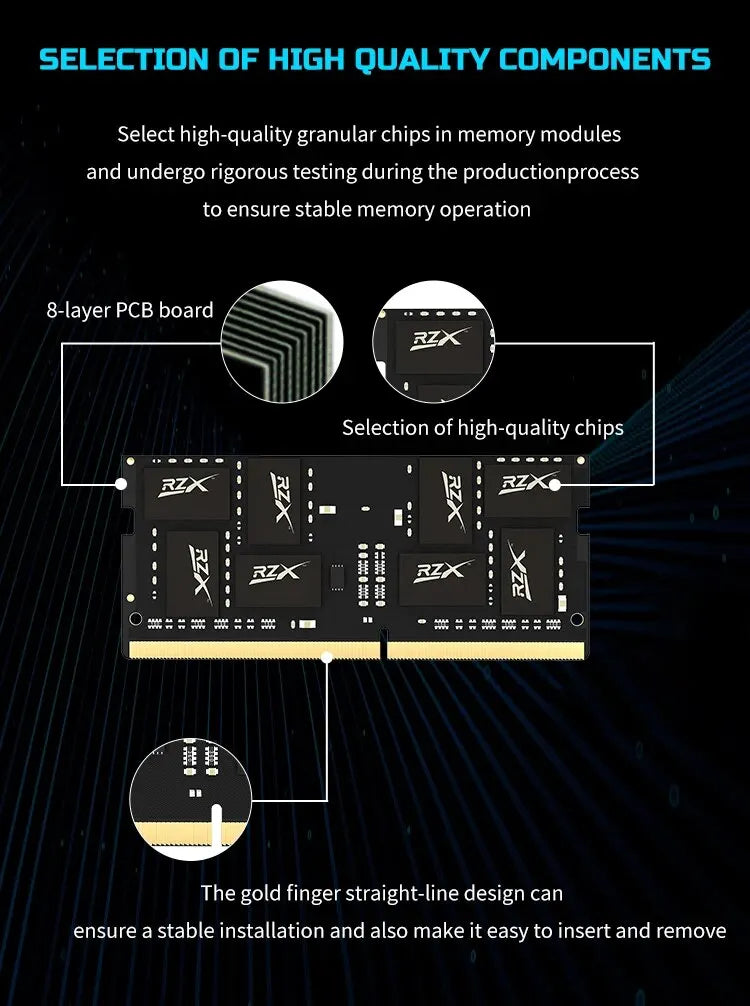 Perfect for upgrading older systems or enhancing the performance of your current laptop, RZX DDR4 memory delivers faster speeds, greater efficiency, and smooth operation across a range of applications—from office work to gaming.