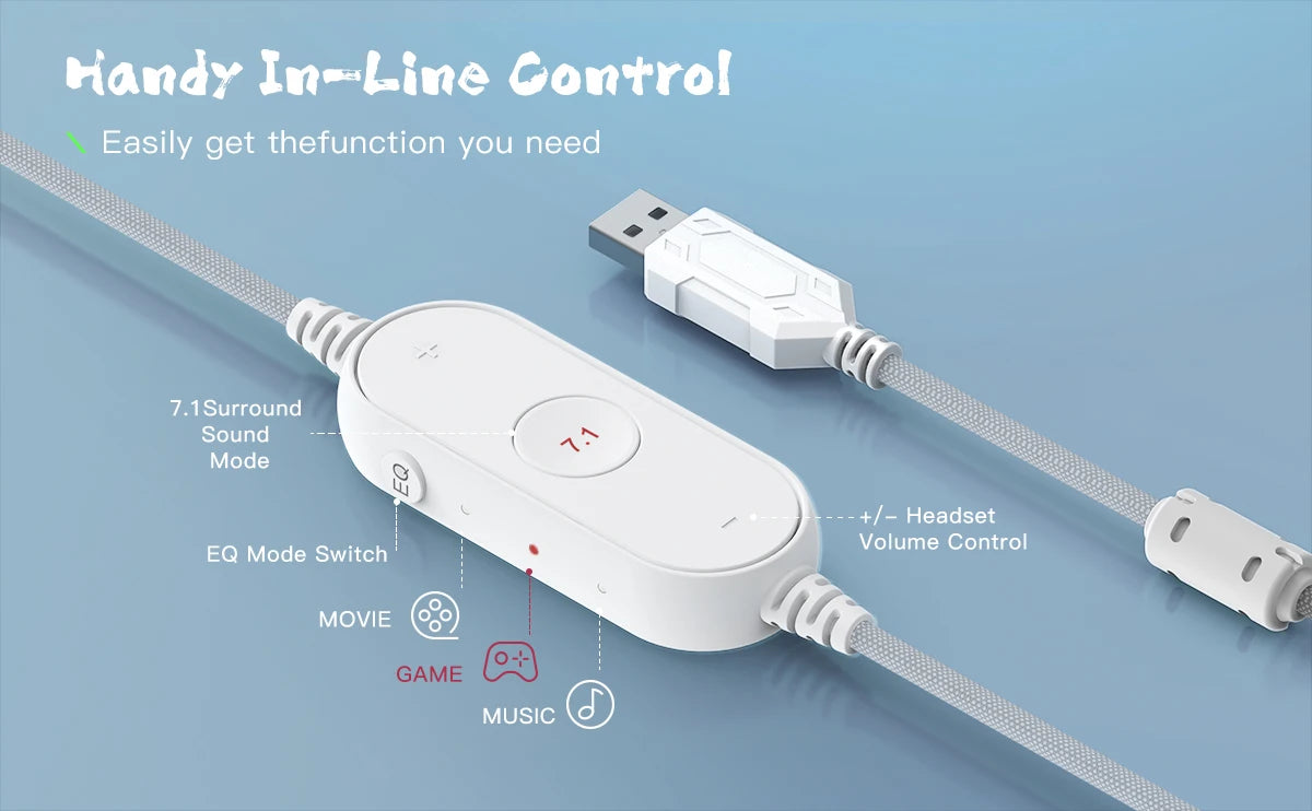 Instantly control your audio without pausing your game. Adjust headset and mic volume, toggle surround sound, mute your mic, and switch between 3 EQ modes (Game, Music, Movie) — all from the inline remote.
