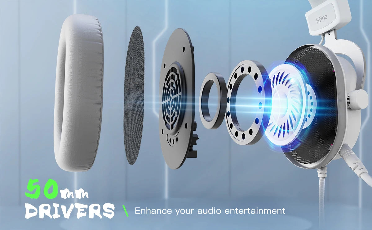 Level up your sound experience with the FIFINE Ampligame H6W, a wired over-ear gaming headset with immersive 7.1 surround sound, 3 customizable EQ modes, and ultra-soft memory foam comfort — all wrapped in a sleek, durable design.