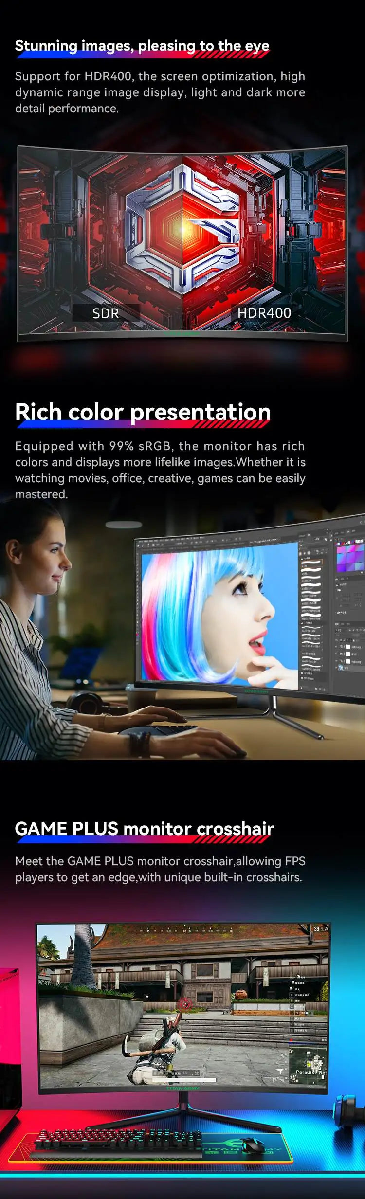 🌈 HDR400 + 3000:1 contrast – deeper blacks and vivid colors