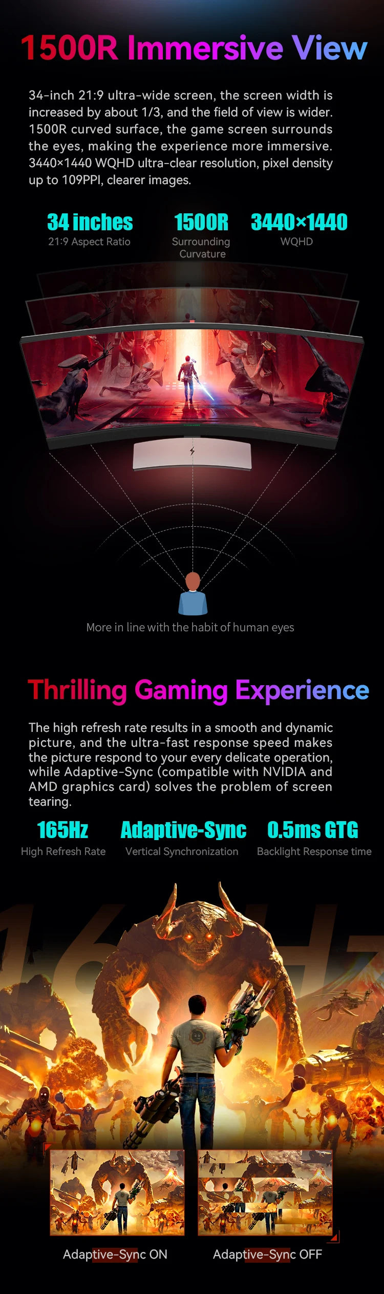 🌀 1500R curved 21:9 screen wraps you in immersive ultrawide action.